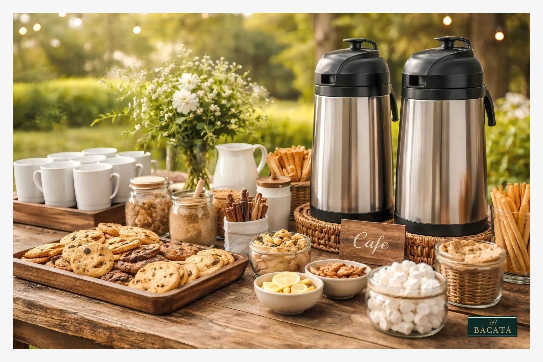 Nuestra estación de bebidas calientes integra café, aromáticas y té, acompañados de palitroques, galletas, hojaldres y frutos secos (estos últimos en la opción premium), dispuestos de forma armónica y accesible. Cada detalle está pensado para brindar comodidad, calidez y una experiencia cercana, ideal para momentos de conversación antes y luego de la ceremonia.