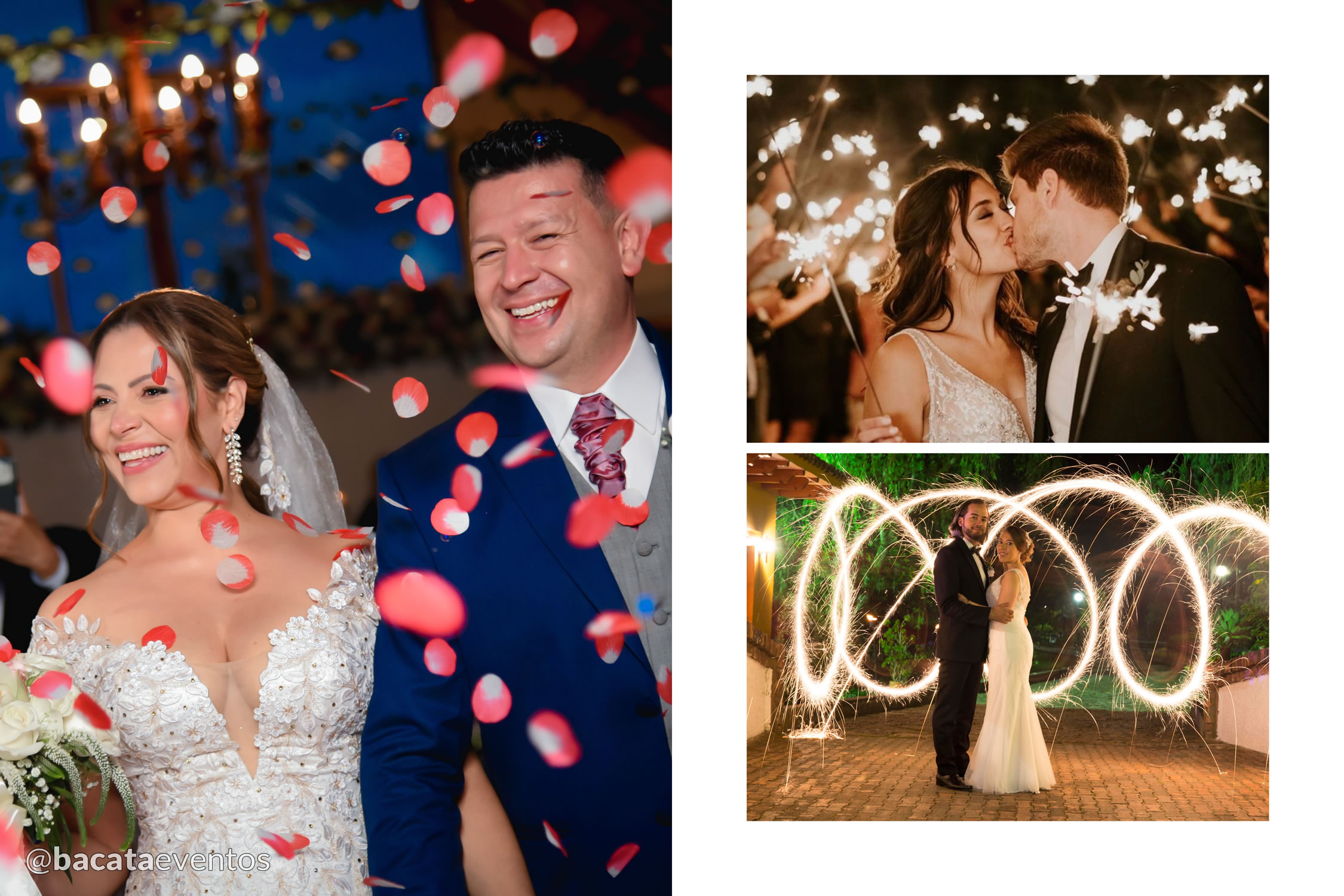 Para la salida de ceremonia: Pequeños conos llenos hojas o de pétalos de rosas, luces de bengala, humos de colores, globos inflados con helio, bolsitas con arroz o burbujeros entre otros para que los invitados lancen a los novios después de la ceremonia.