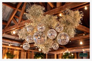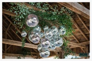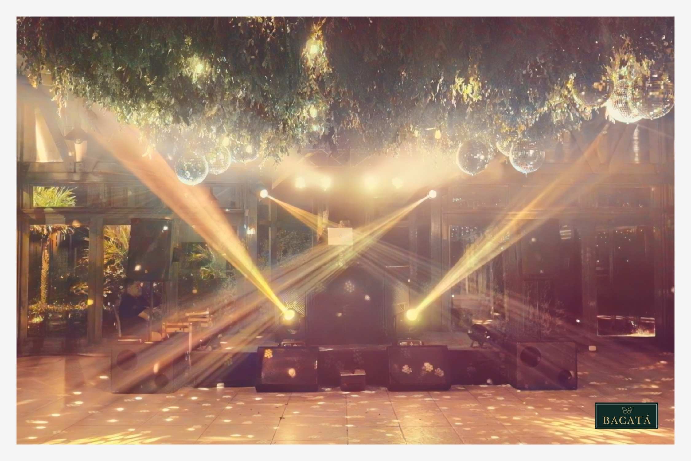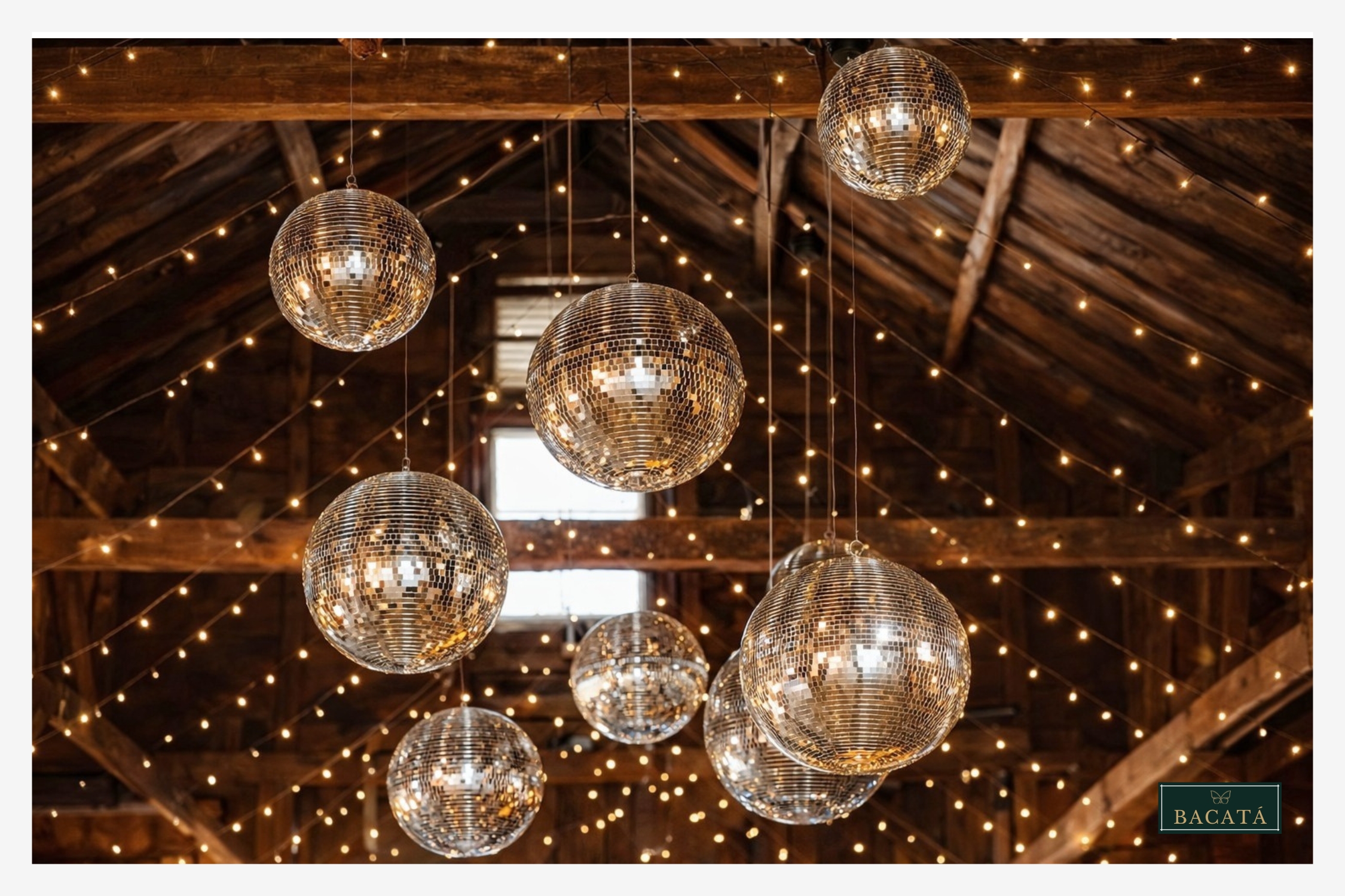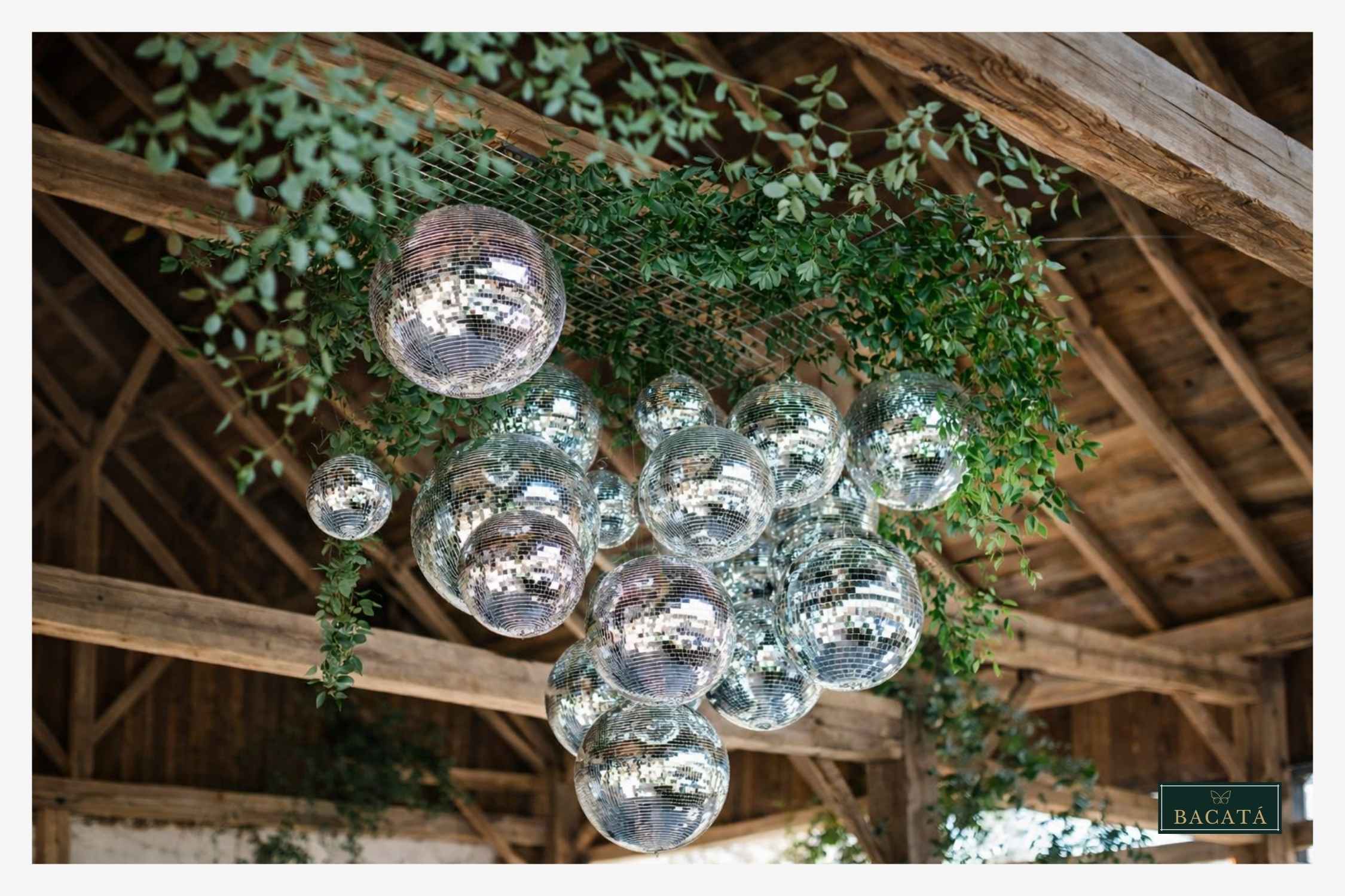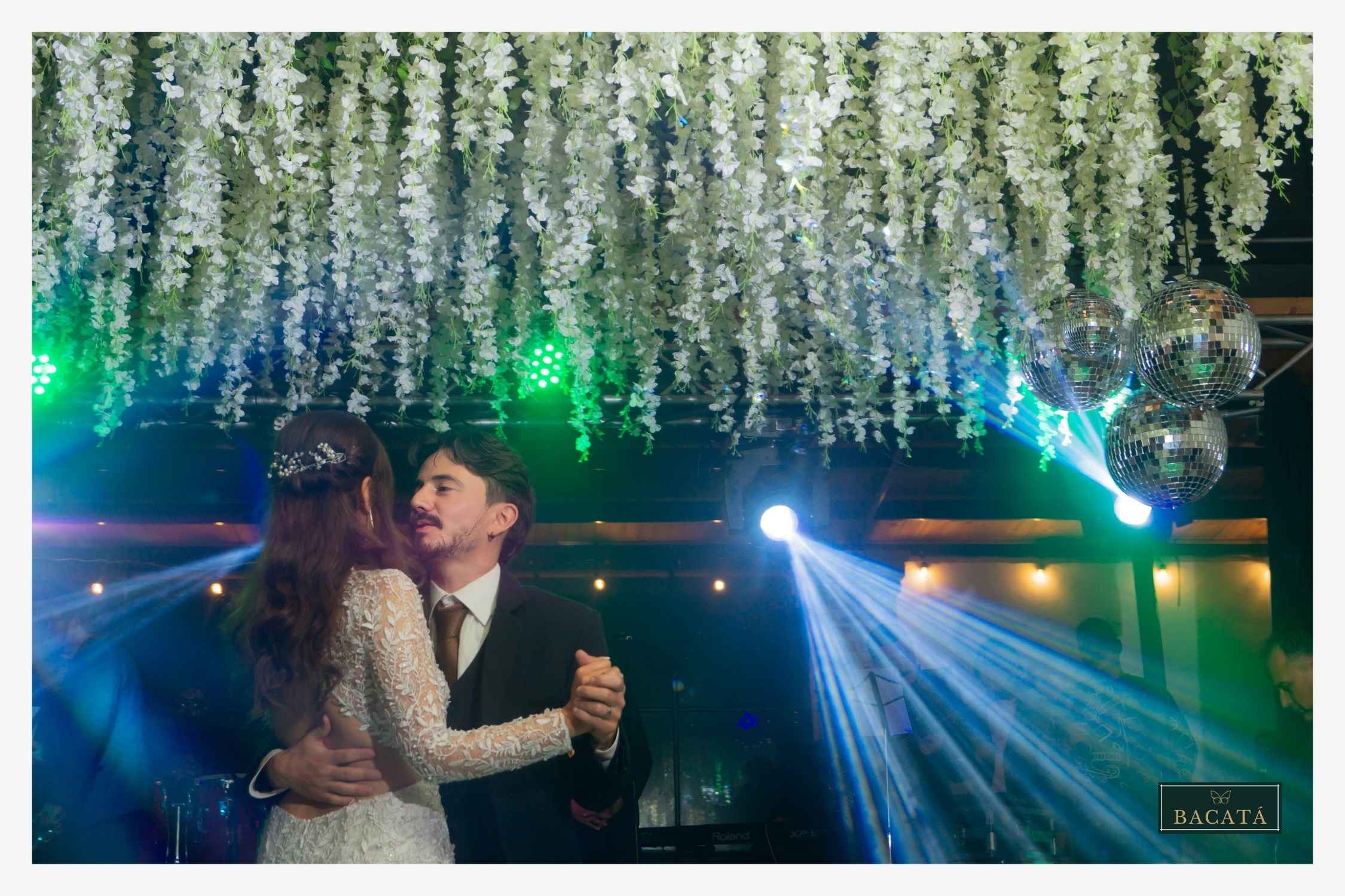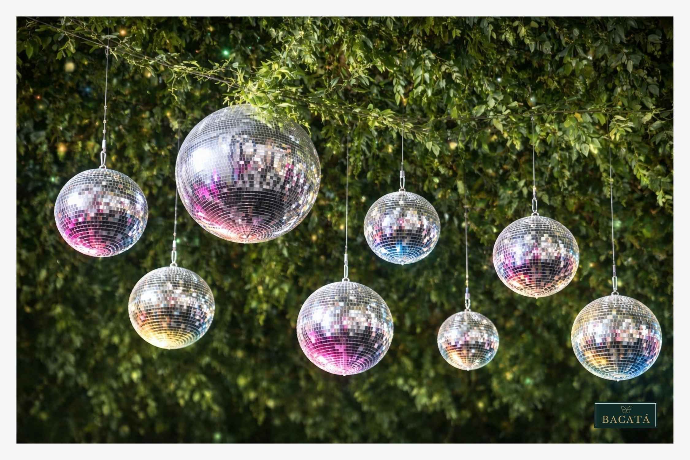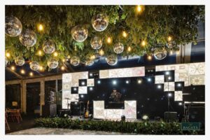 La decoración con bolas disco suspendidas sobre la pista de baile crea un ambiente vibrante y sofisticado que combina elegancia con energía festiva. Al reflejar la luz ambiental y las luminarias del evento, estos elementos generan destellos dinámicos que llenan el espacio de movimiento y brillo.