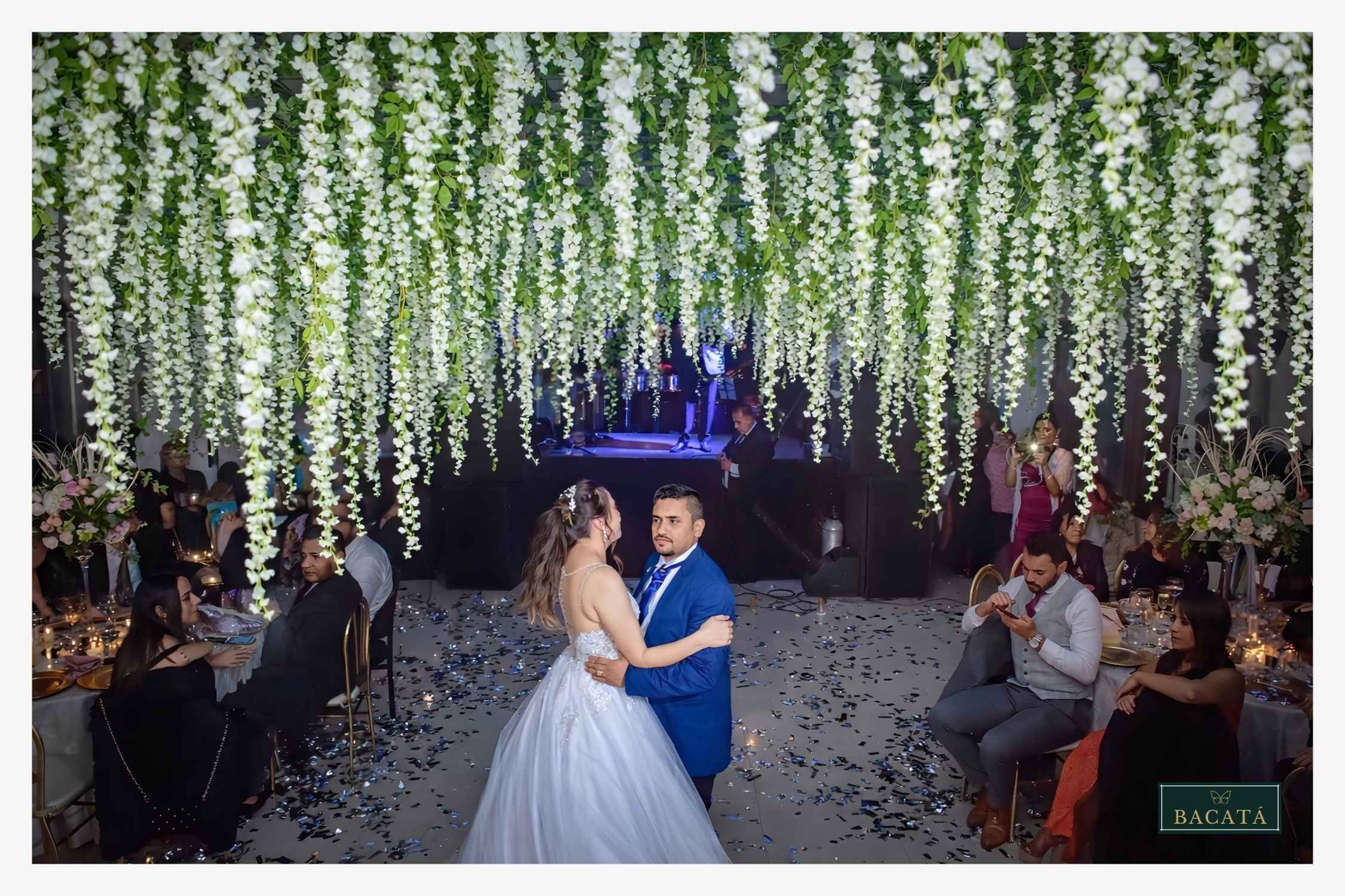 Los montajes aéreos con flores y follajes suspendidos sobre la pista de baile aportan un ambiente romántico, natural y lleno de encanto. Esta decoración crea la sensación de un jardín flotante que envuelve el espacio con texturas orgánicas y elegancia visual.