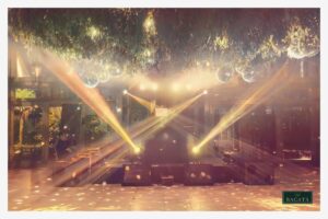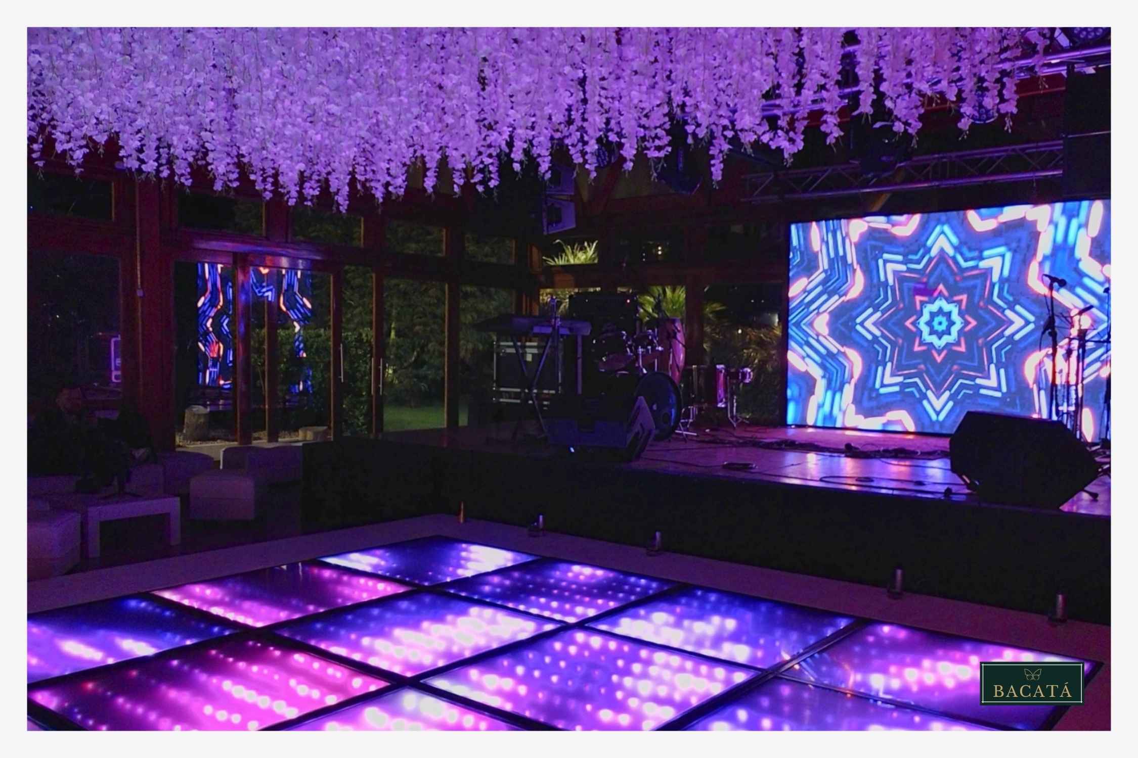 Diseñamos montajes aéreos y escenografías que transforman por completo el ambiente del evento. Las pistas de baile y los techos se convierten en verdaderos escenarios de fantasía donde la iluminación, las texturas y los elementos decorativos crean atmósferas memorables que acompañan cada momento de la celebración.
