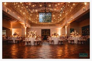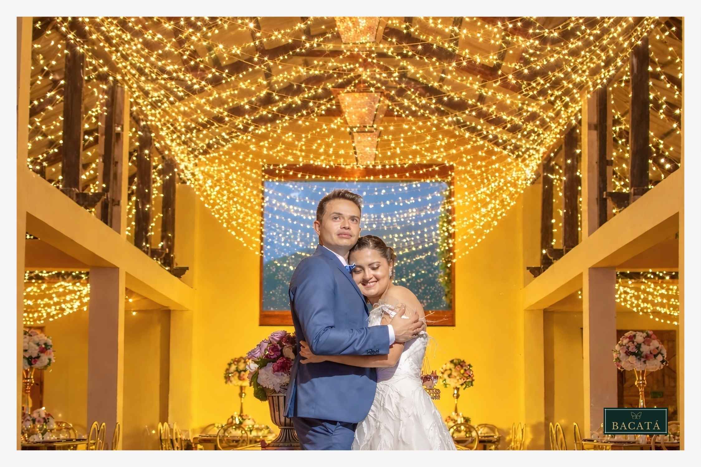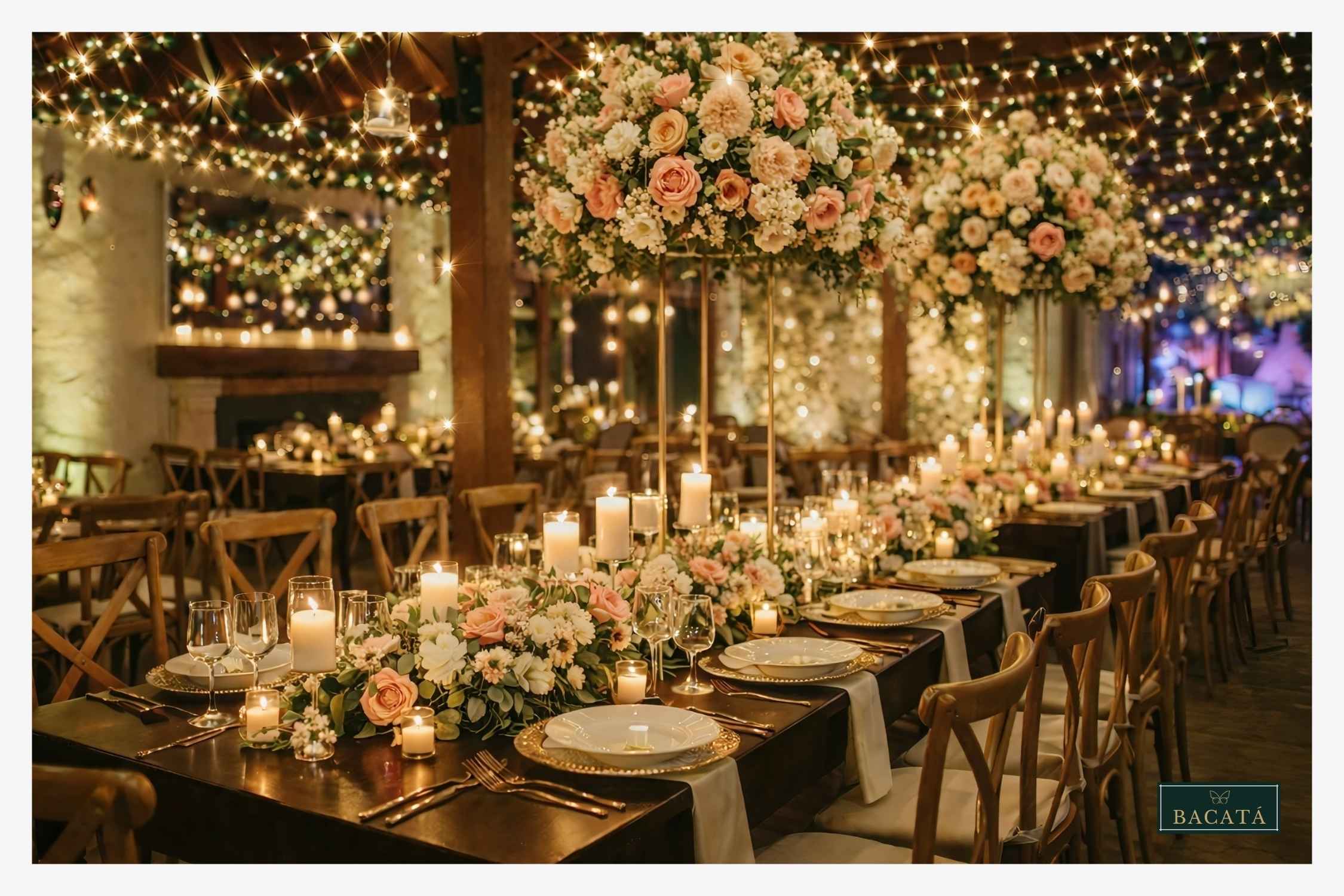 Las luces tipo arroz suspendidas en el techo del salón crean una atmósfera cálida, envolvente y profundamente romántica. Este montaje transforma el espacio en un cielo de luces que aporta una sensación mágica y acogedora para los invitados.