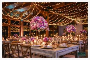 Cada diseño se adapta al estilo de la boda o evento, combinando iluminación cálida, follajes, flores o elementos decorativos suspendidos que aportan profundidad visual, elegancia y una experiencia inmersiva para los invitados.